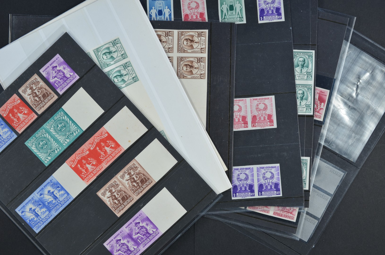 INDONESIË 1950-1957, Proeven, los, in paren en in blokken waarbij met tussenstrook, alsmede een zestal metalen drukplaatjes. Prachtkoop met zeer hoge cat.wrd. (vlgs. inz. ca. € 13.000)