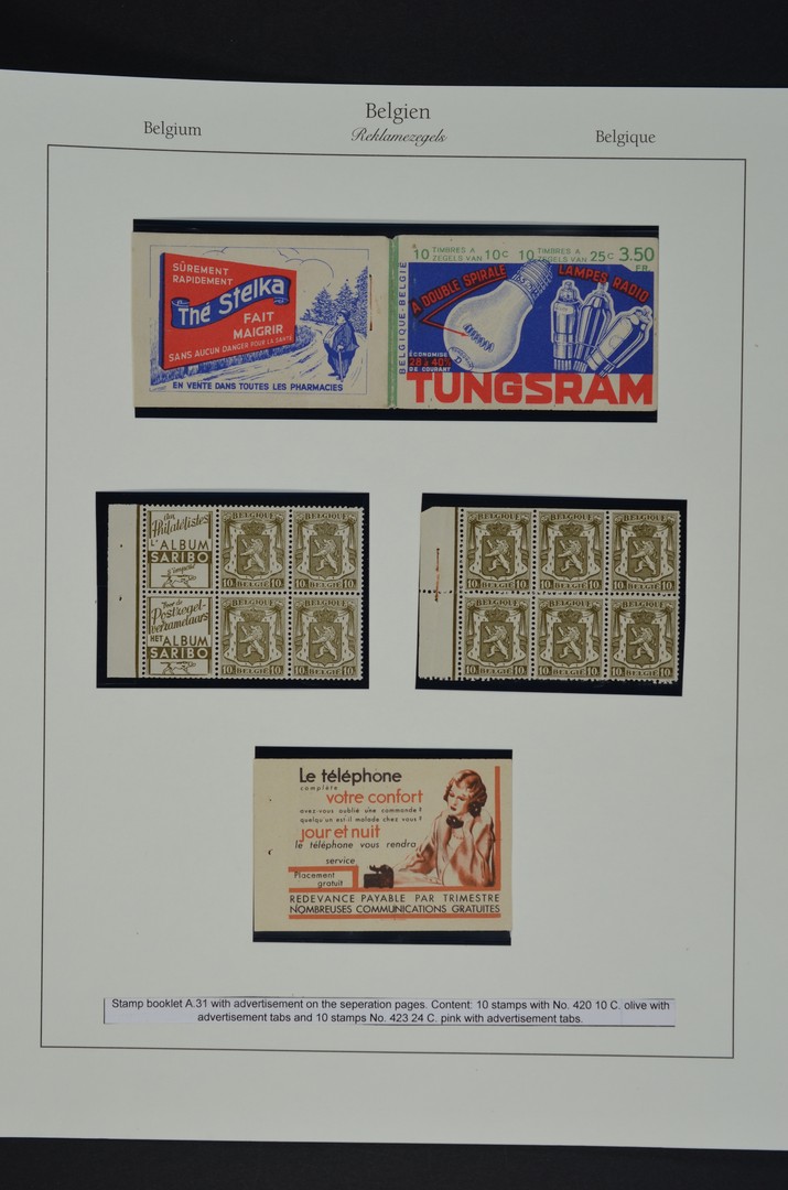 BELGIË, kleine verz. postzegelboekjes op albumbladen, met o.a. 10a, 10b (2), 13d (2), 30, 31, 34a, 35b, meest op amerikaanse manier (los) verzameld