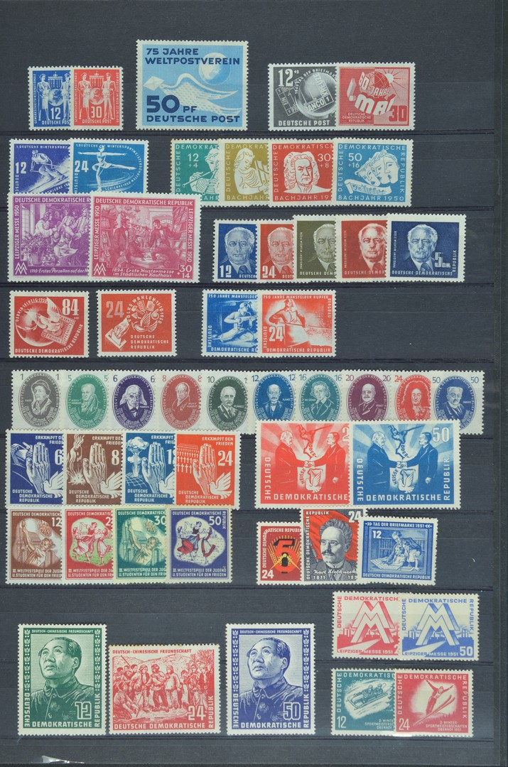 DDR 1949-1953, meest postfrisse verzameling op drie insteekbladen, incl. de betere nrs. en series in nette kwaliteit, tevens Goethe-blok gebruikt