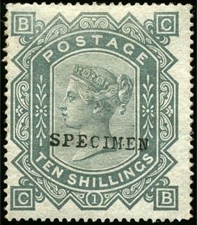 S.G.128, 10 Shilling greenish-grey, plate no. 1 CB, with 'Specimen opt.', very fine unused with large part original gum, slightly toned, £.4250