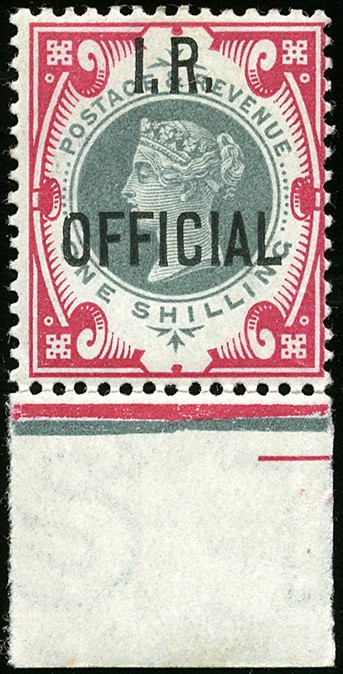 S.G.O19, 1 Shilling green and carmine, a mint never hinged (!) copy of this scarce stamp, signed Grobe, £.4200++