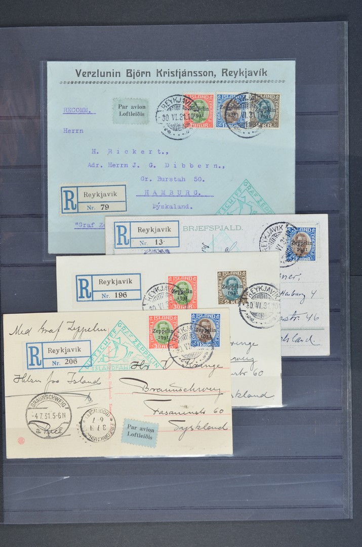 IJSLAND, Zeppelin-IJslandvaart 1931 met cpl. serie Mi.147/49 op aangetekende naar Hamburg, alsmede de vaarten Mi.nr.193Aa, 193Ab en 193Ac, cat.wrd. Mi. Zeppelincatalogus (2002) € 975