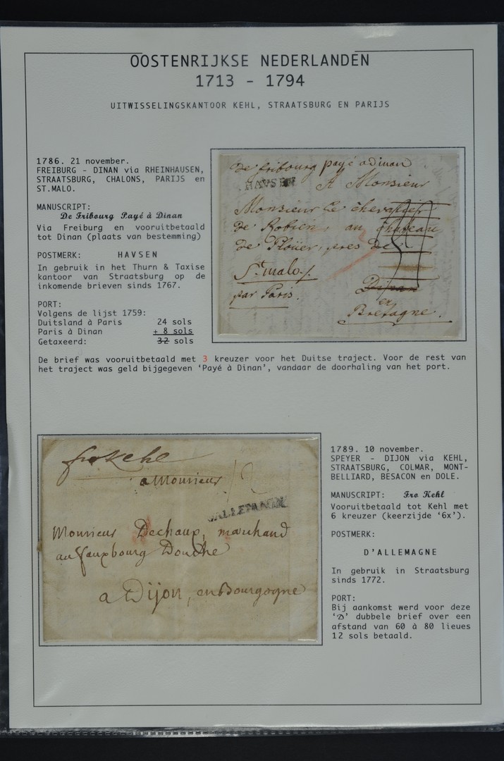 VOORFILATELIE. De Oostenrijkse Nederlanden. Prachtige samenstelling van 130 kwalitatief uitzonderlijk mooie, complete vouwbrieven uit 1714-1796, waarbij diverse postale aanduidingen, portbedragen, grenskantoorstempels als 'H' in cirkel, 'D'HOLLANDE' en 'HOLLANDE' in diverse typen w.o. schaarse, naamstempels, bijzondere adresseringen, alles even goed gedocumenteerd en merendeels professioneel opgezet op bladen, in 2 ringbanden. Voor de ware liefhebber van de oude postale geschiedenis een unieke koop