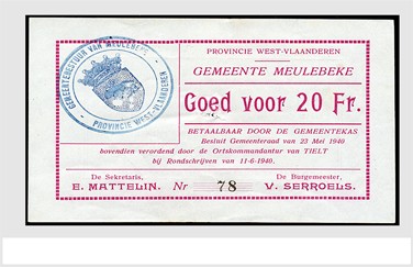 BELGIË, Noodgeld Gemeente Meulebeke 1, 5, 10 en 20 Frank, 1e uitgifte 1940, serienummer allen met hetzelfde nr.78, de biljetten zijn origineel ontwaard met doorboring, overgens prachtige ex. en zeer zeldzaam