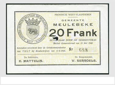BELGIË, Noodgeld Gemeente Meulebeke 1, 2, 5, 10 en 20 Frank, 2e uitgifte 1940, serienummer verschillend, de biljetten zijn origineel ontwaard met doorboring, overigens prachtex. en zeer zeldzaam