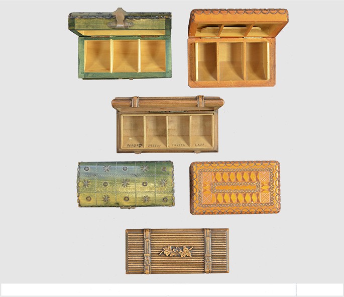 POSTZEGELDOOSJES, 3 mooi bewerkte houten doosjes, 2 drie-vaks en 1 vier-vaks doosje